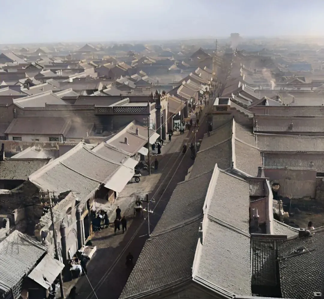 这一张,从大中楼往外俯瞰,能看出当年临汾家家挨着家,房顶一色的灰瓦,马路笔直,黄尘扬起来,左右全是低矮旧宅,有人推着小车,有人牵牲口,街面不宽,人影细长,不用多说,生活就在这一片错落里熬着。