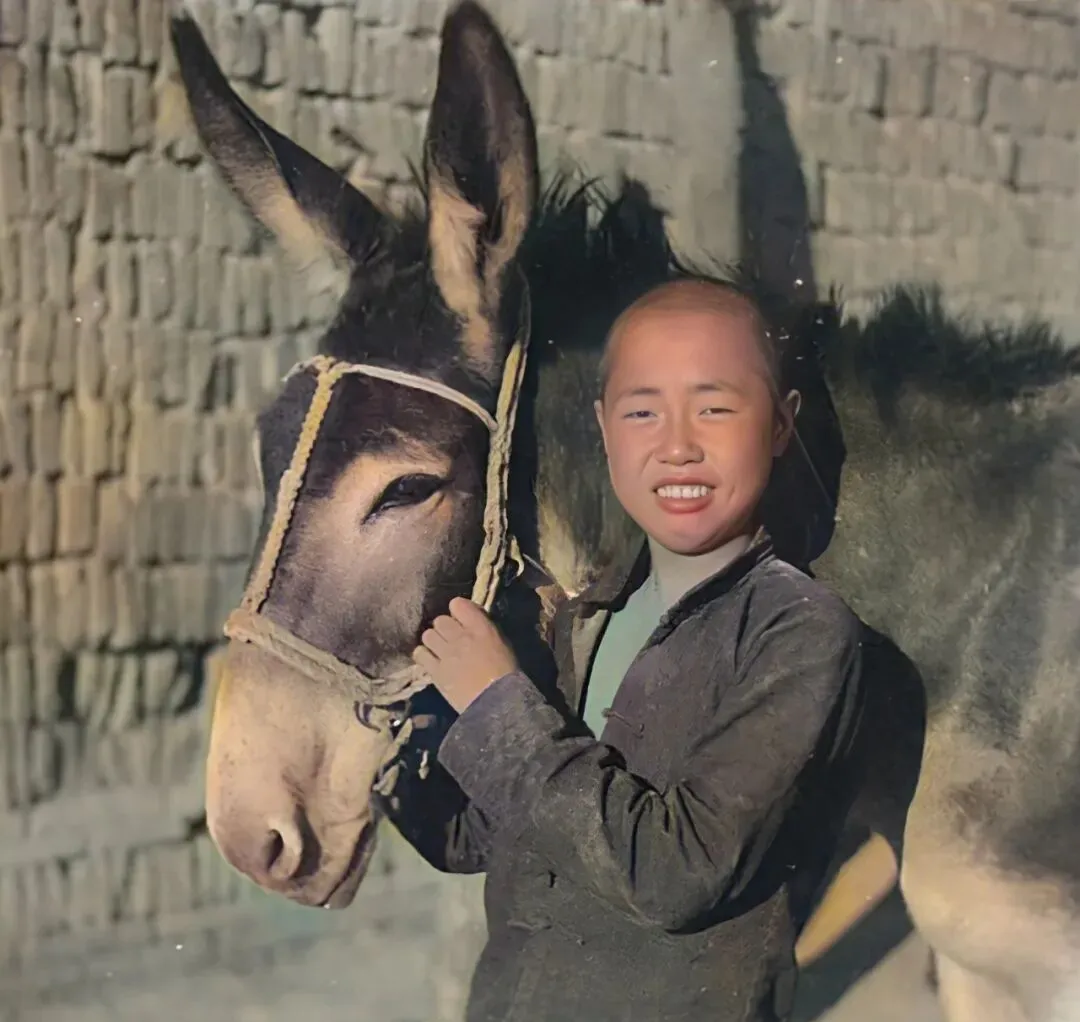 图上的哥们牵着一头驴,笑得特实在,驴鼻子边搁着大手,耳朵直着往天里竖,这玩意是那时候的头号交通工具,谁家有头毛驴,赶集拉柴都省事。