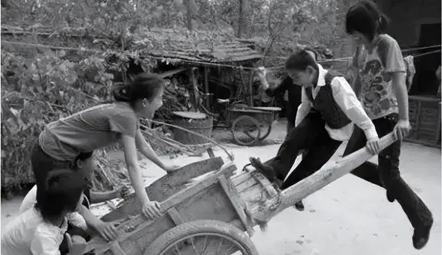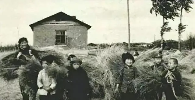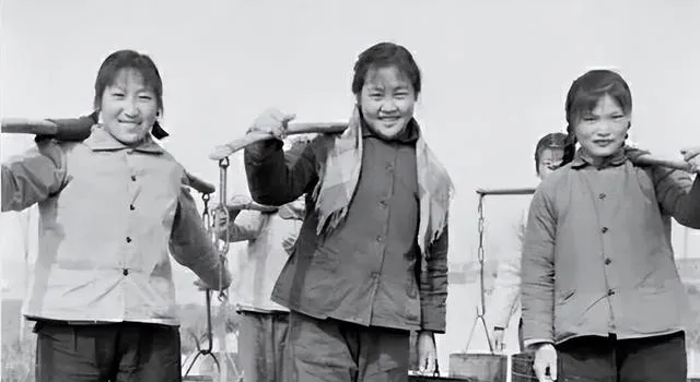 背草、拉车、挑担这些画面,也很具体。背草的孩子和大人站在土房前,草捆几乎把人压住;几个年轻人推着木车,脚都蹬到了车帮上,那种吃劲感,隔着照片都能看出来。还有女孩挑着担子冲镜头笑,衣服是最普通的棉袄,辫子也没什么修饰,可神情特别亮。以前常听老人说,那时苦归苦,大家心里有奔头。你要问“奔头”长什么样,可能就藏在这些表情里。