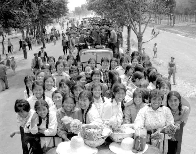 卡车上挤满了姑娘,前面一张张笑脸,后面车头上还站着一群人,这种热闹劲,现在很难复制。她们穿得都不算讲究,花衬衣、短辫子、素面朝天,可那种青春气是真藏不住。要是不说年份,你会猜成什么时候?