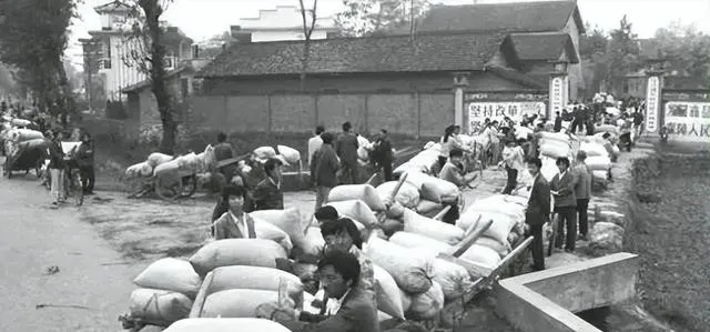 交公粮那张也耐看。麻袋一袋袋堆着,独轮车、自行车、肩挑背扛都上了。路是土路,院墙是旧墙,可人来人往,秩序一点不乱。这样的场景,现在年轻人未必见过。它不是浪漫化的乡村生活,而是很实在的日子:种地、收粮、上交、再接着忙下一茬。