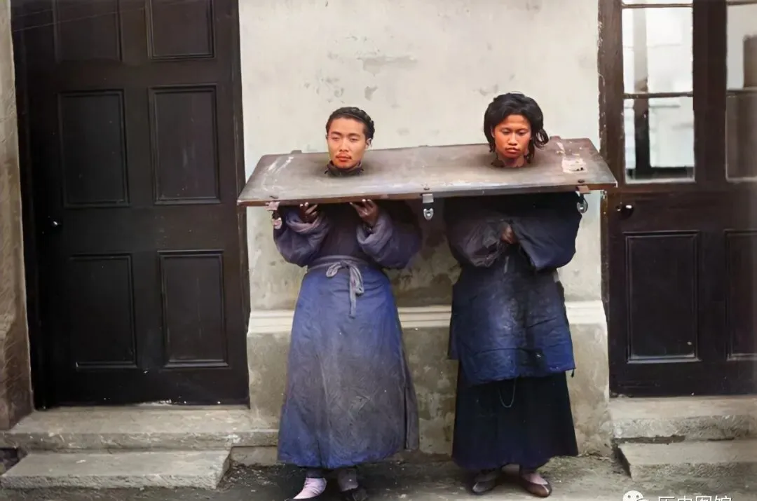 图里这俩人,一个男的一个女的,脖子卡着一块老厚的木枷,从肩头压下来,脸上那股劲——男的看着像是在死撑,女的低着头,什么都不想理,这个场面啊,老一辈叫“示众”,“撒泼耍赖的不怕,戴枷示众才长记性”,我姥爷就说过。