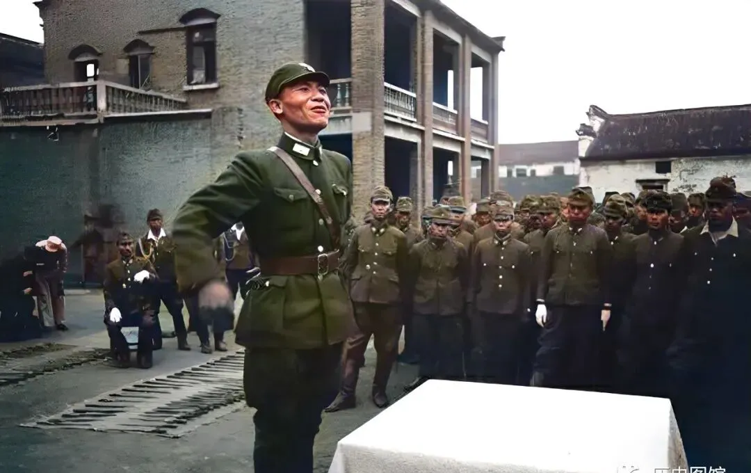 这张看着气色特别足的是一队士兵列队站齐,中间一位穿着绿军装的中国军官,胸膛挺得老高,嘴巴稍带点笑,劲头别提多带劲,这场面是日本投降那年留下的,安徽芜湖临时关起来的日兵,他们的武器被码得平平整整,挨着墙根堆着。