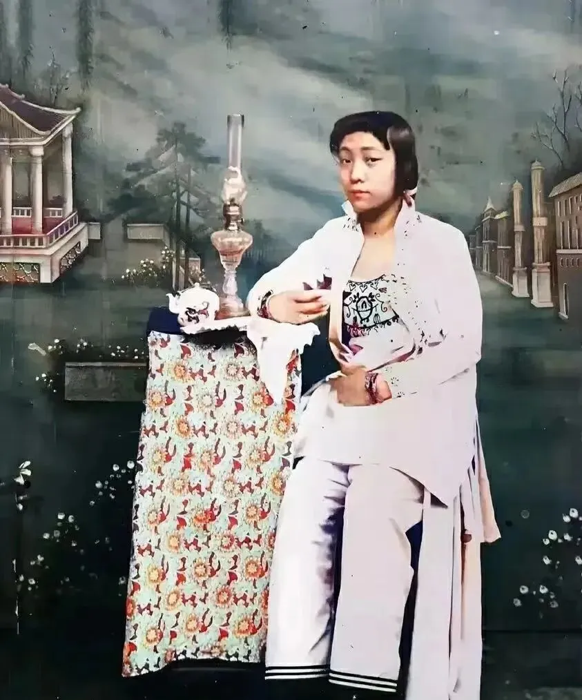 这个女子打扮得特别,衣襟半开,露出里面刺着花的亵衣,她人坐在一张铺着花布的桌前,手里正端着杯子,灯油灯、茶壶、折扇插在边上,照片底色花花绿绿,像是特意在相馆调出来的气氛。