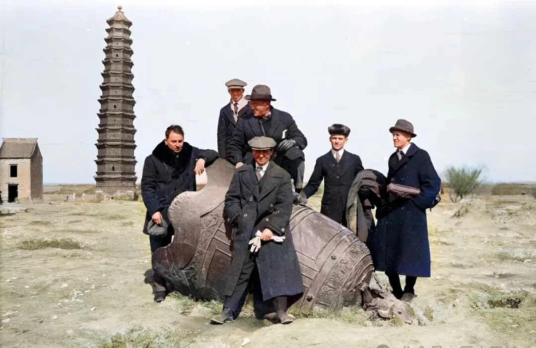 老照片:1938年,河南开封铁塔前大钟不翼而飞,日本人干的?