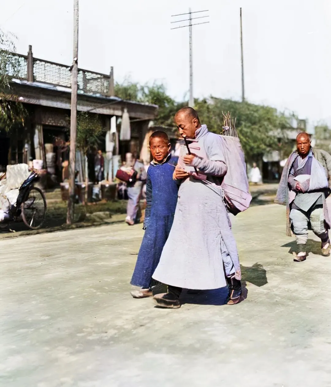 第三张照片真是耐看,老北京的街上,走来一位穿长衫的男先生,肩头挎布袋,琴筒鼓鼓囊囊,拉着京胡闭着眼走路,十来岁的孩子牵着他衣角,脚步贴着地,小声提醒:“爸,前头有台阶,慢点”