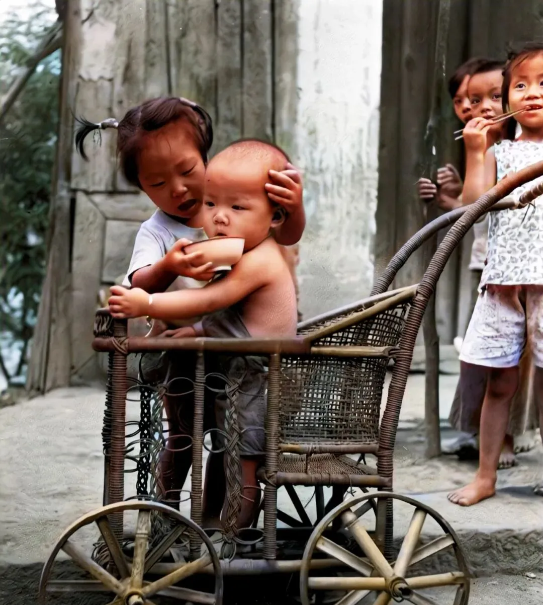 这个画面叫竹编婴儿车里的姐弟,1959年成都,竹椅车轮子嘎吱晃悠悠地停在家门口,大姐手上的饭碗端得稳,另一只手怼着弟弟脑袋不让他跑,嘴里喊着“快吃啊”,小家伙偏不张嘴,脸蛋嘟嘟的,还戴了只小银镯子,那酸爽劲儿,外人看着乐,亲姐看着急。