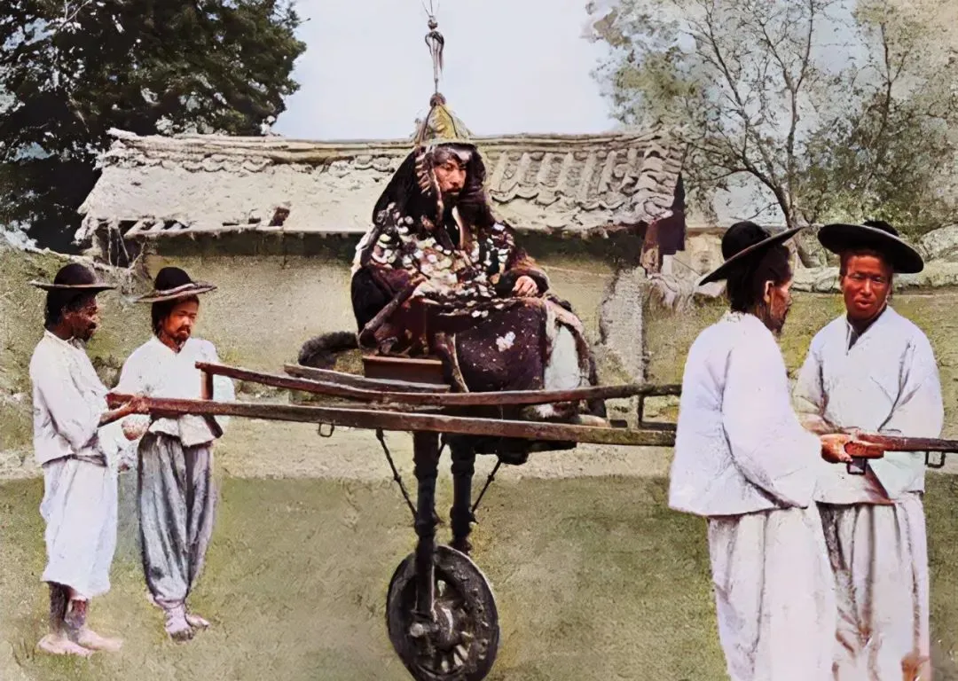 这阵仗,说好听点是稀奇,说难听了就是“滑稽”,看着像谁家抬亲的彩轿,偏偏只用一只大轮支着,人坐在上面晃晃悠悠,一不小心就能掉下来,爷爷头回见到这样的照片,也是直称稀罕,后来说这玩意儿大多是没马骑,又想讲点排面才有的,韩国人也爱说独轮车是祖宗发明,谁也说不清,反正那年代的物件就爱琢磨得花里胡哨。
