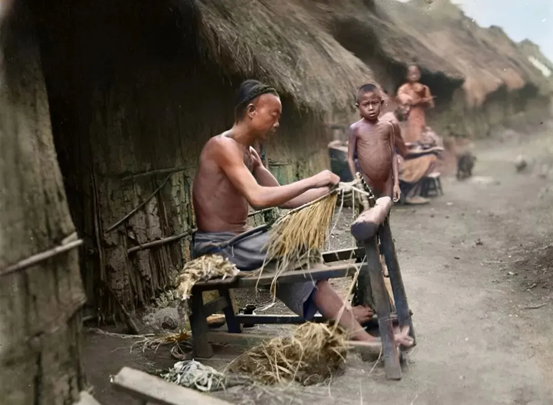 做草鞋的手艺人坐在土墙边,草茅屋一排排连着,胳膊上的青筋随着搓麻的动作跟着鼓起来,脚边全是干草捆,捻草的手动作麻利,像家里老一辈做针线活儿时,嘴里嘀叨着啥,让小孩一旁别添乱,画面墙皮剥落,地上起尘,但你能从头发和肩头的汗珠里看出日子不容易,甘博相机架着,捕捉的不是多体面,只是最普通的一种活法,以前一双草鞋能扛半个冬天,现在谁还舍得找手工的。