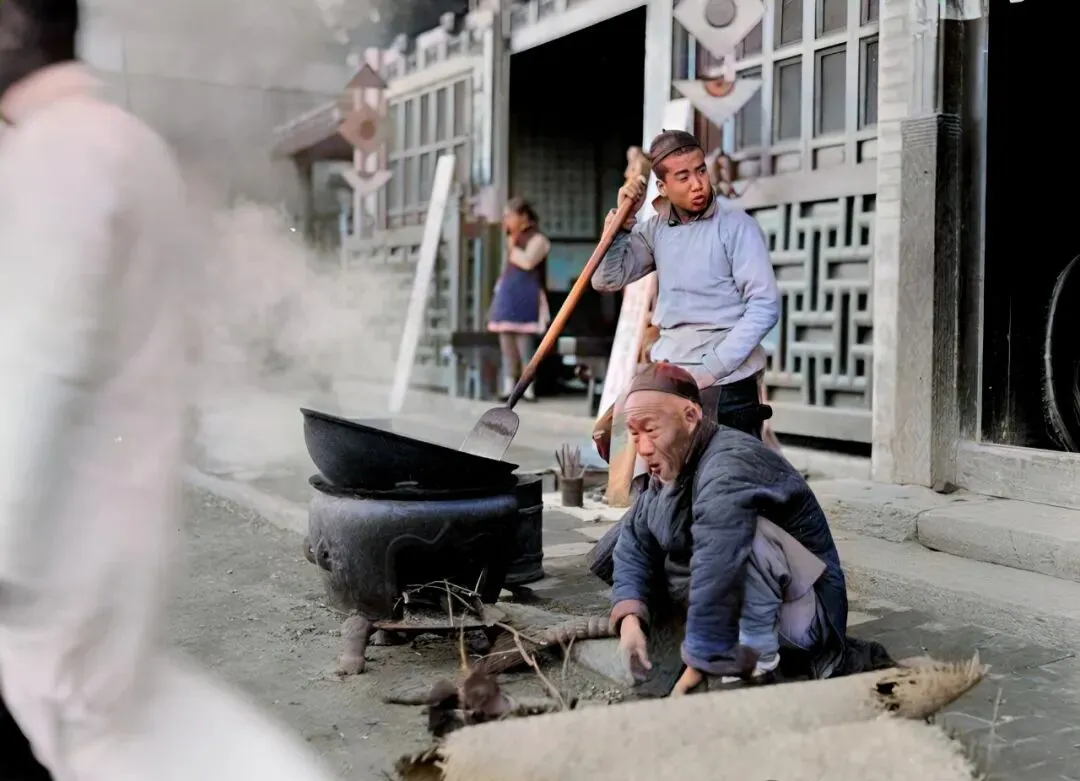 街头的大锅灶,烟雾里藏着一锅老味道,一老一少两个人配合着,下面捡柴的神情认真,锅铲搅动的手没歇过,远处站着个女人,背影里也带着点羞涩,灶台石头砌的,黑锅子翻腾的热气最有“人间气”,甘博爱往人民堆里扎,他镜头下的大锅饭能留下热气腾腾的“烟”味,一看就是那个年代的生活样子,现在城市小区里早没机会闻灶火味儿,只留脑海琢磨。