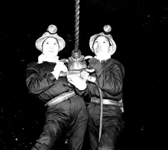据有关资料,这张照片拍摄于1966年,记录王凤煤矿妇女掘进队队员王爱珍与宋成莲,在井下操作电钻打炮眼的瞬间。她们头戴柳编安全帽和矿灯、身穿工装,双手紧握电钻,目光专注地望向煤层。在那个“妇女能顶半边天”的年代,她们不是在井口的旁观者,而是深入地心、挥汗如雨的煤炭采掘者。这种示范作用,引发全国许多煤矿争相效仿,如开滦煤矿女子采煤队、大同煤矿女子掘进队、抚顺煤矿女子采煤班。