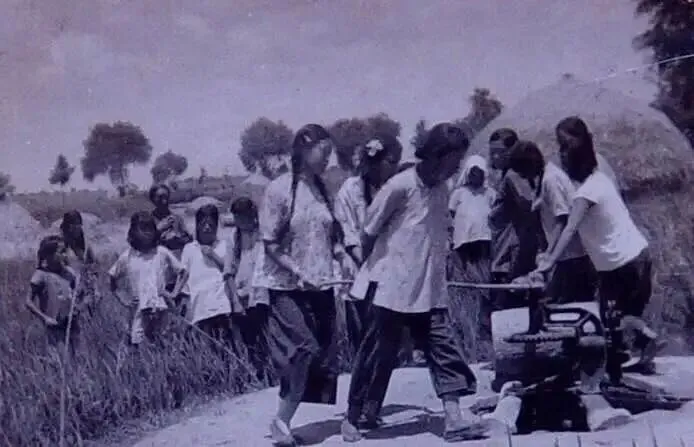 1958年单县徐砦乡穆桂英突击队推水车浇稻子