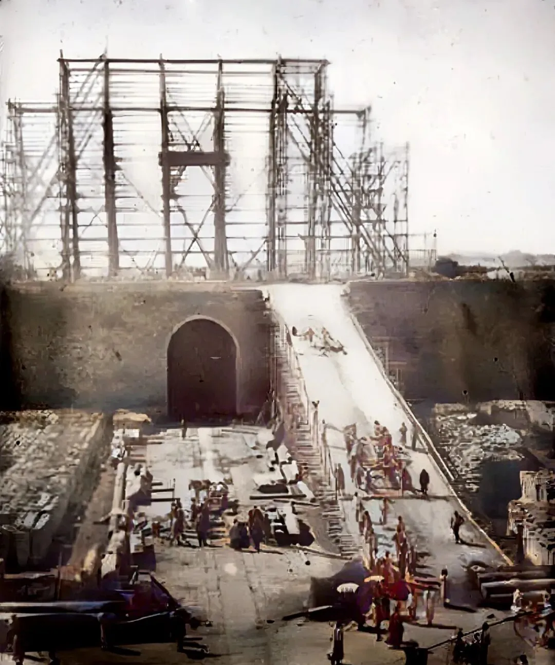 1903年这是工匠们正在重修被八国联军毁过的正阳门,前面搭着坡道,要把木料砖块一车车推上城台,架子搭得快赶上城楼高,一根根杉木杈子硬生生撑起来的阵仗真带劲,小时候见街头盖房子的小工累得直喘气,哪懂这古人更是硬脾气,那年头工具都靠肩扛手搭,啥都能硬生生攒出来。