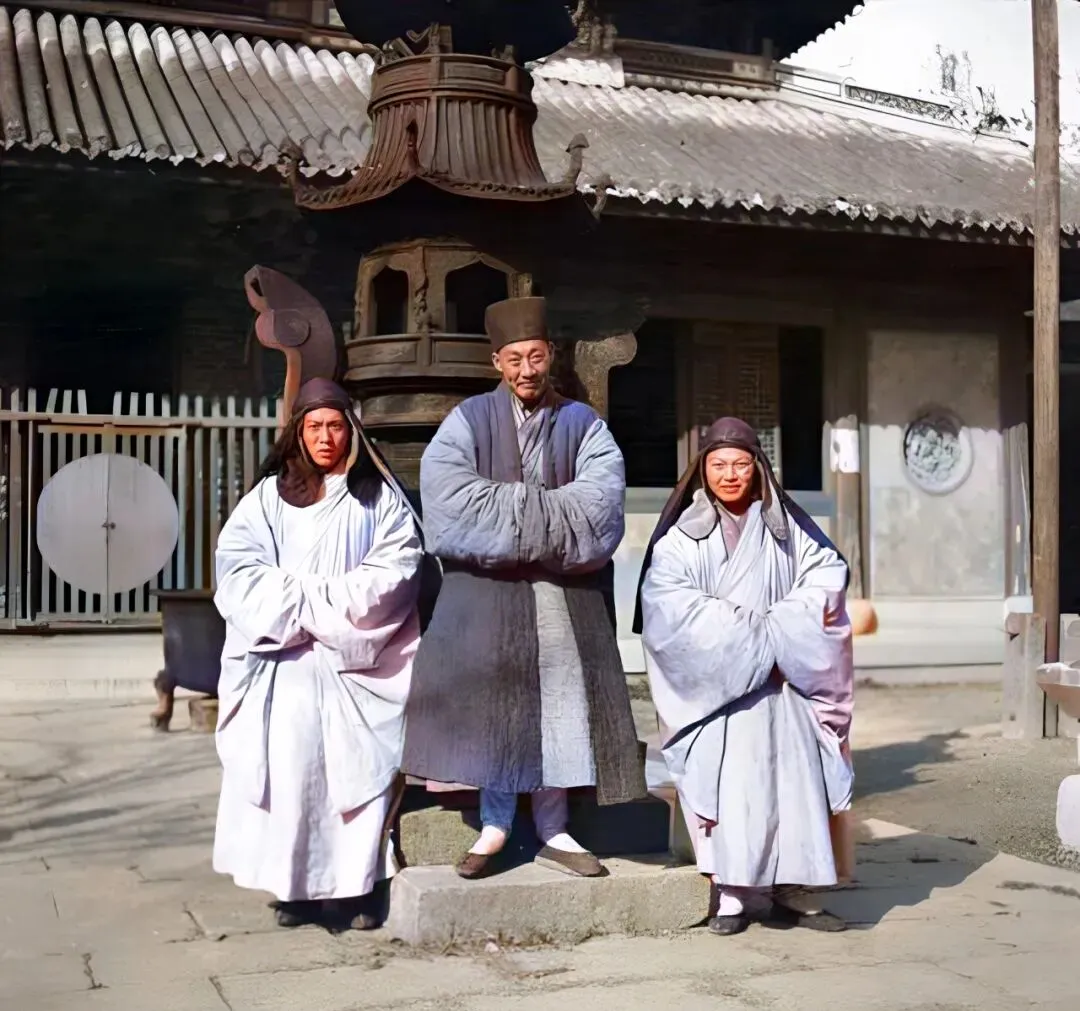 男道士站中间,左招右引俩坤道,棉袍布帽穿得妥帖,笑容不假,老一辈看见说,这些道观里分工讲究多,动作摆得稳当,别看穿得朴素,气质和气场都不差。