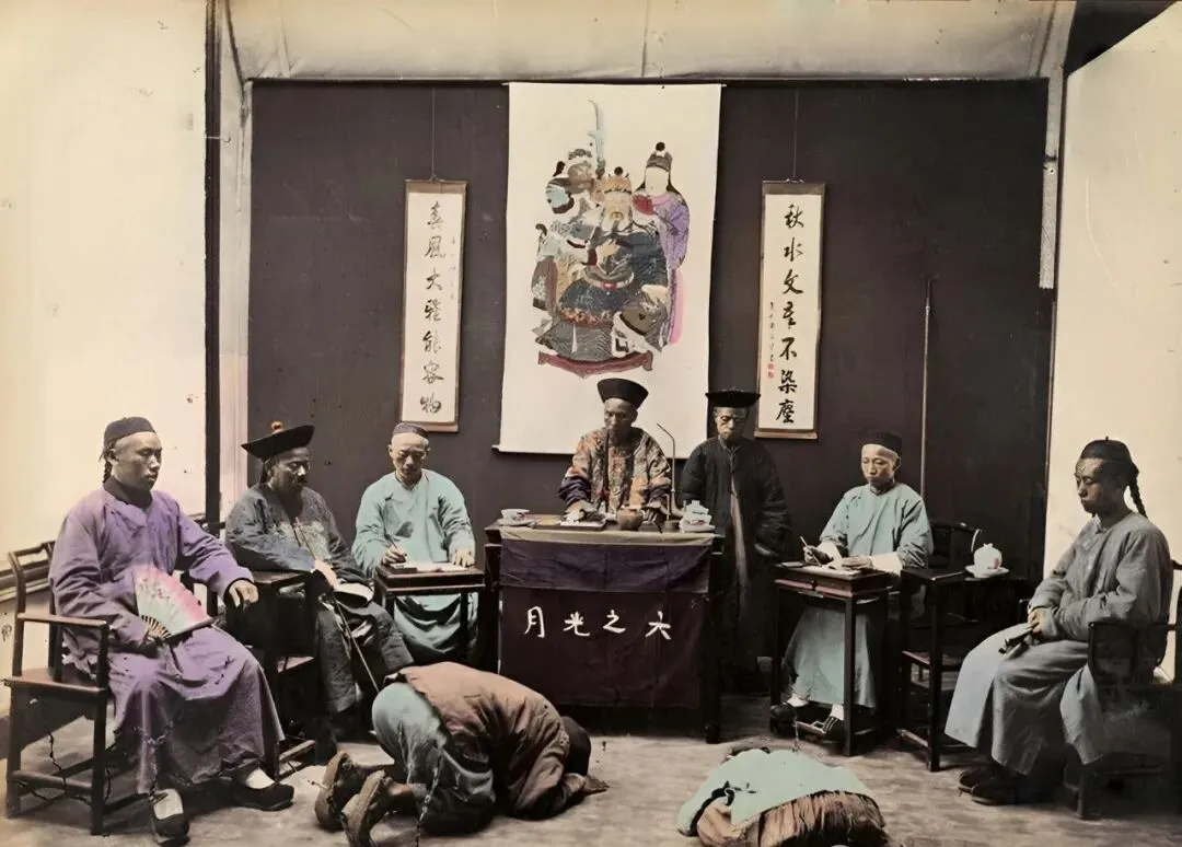 照片上官员矜持端坐堂前,两边师爷写得飞快,跪地的犯人头也不抬,左右有旁听的,厅里挂的画、桌上的桌布都能细细瞧出趣味,那时讲究就是场面,啥都得挑最威风的给别人看。