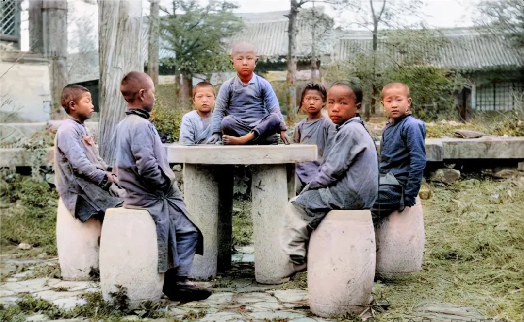 六个孩子围着石桌坐成圈,桌上没见点心没见书,估计在琢磨怎么玩儿,衣服褶皱里藏着人间小忙活,谁说小日子只有大人的操心,孩子们凑一座桌,也能玩一中午。