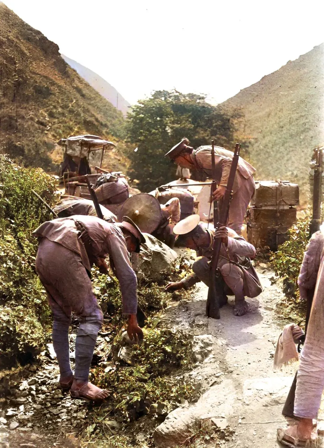 现场再看,枪不离手,古旧的步枪,木质枪托被汗浸出包浆,腰间挎包里可能还塞着干粮和弹药,那年代没有今天的装备,护卫真靠这点家伙保平安,路边一看,全是一袋袋行李,壹堆破旧小箱子,三张破布一盖,这队伍走大山,那都是累出来的。