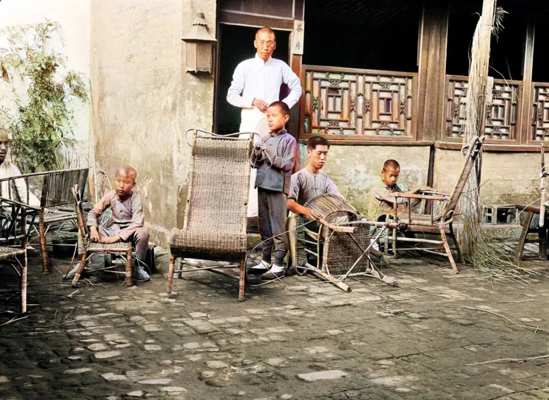 照片细看,几个孩子年纪都不大,有的甚至看不到眼神,就是个拼命的动作在那转悠,编椅子的手法是一圈一圈摸着走,边上藤条搭得整整齐齐,小手指头细得像棍,摸着线的时候那股认真劲别说大人,自己现在都学不来,有人说这些孩子是童工,被雇来干活,站院门口那个穿白衣服的精明男人像是老板,盯得紧紧的,眉头带着股官气。