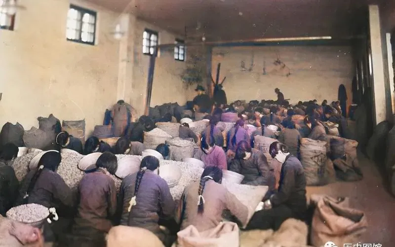 那时厂房里,全坐着扎麻花辫的女工,身子一弯,麻袋挤在脚边,手上全是油腻腻的花生壳,图中这场面指不定是哪家作坊,一排排姑娘低头剥着,屋里静得能听到“沙沙啦啦”,那会儿机械不多,这些活计只能靠双手撑起来,奶奶说干这活手指头都磨得秃亮,挣点钱也得攒着给家里添布票,现在的工厂哪里见这样的景象。