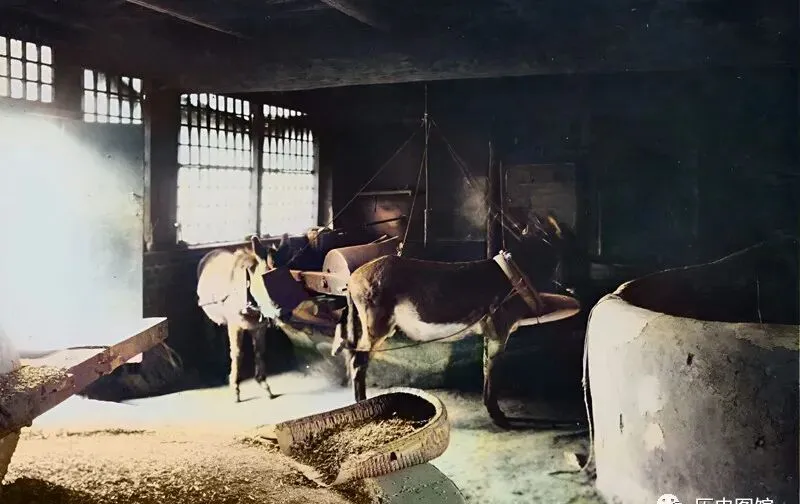 这张里头,黑漆漆的屋子里两头毛驴蒙着眼在石碾旁打圈,碾道上一层层稻谷戳着光,驴蹄敲在地上“咯哒咯哒”,小孩在外头就能听得清清楚楚,作坊的人说,要是驴累了得立马停下来歇会儿,酿出来的酒,舀一勺透亮,冲鼻甜香,和现在的瓶装烧酒不是一回事。