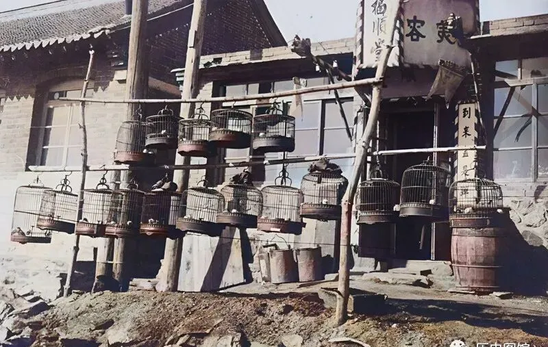 这门口挂着成排鸟笼,木棍搭起的简易架上笼子都摇摇晃晃的,鸟雀叽叽喳喳闹得热闹,门匾上写着“福顺堂”、“美容”,那会儿养鸟是种讲究,清早街上就有人拎着鸟笼遛出来串门,孩子们盯着看半天,哪舍得撒手。