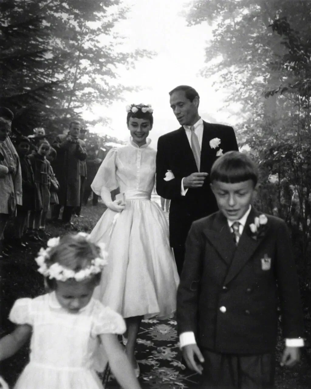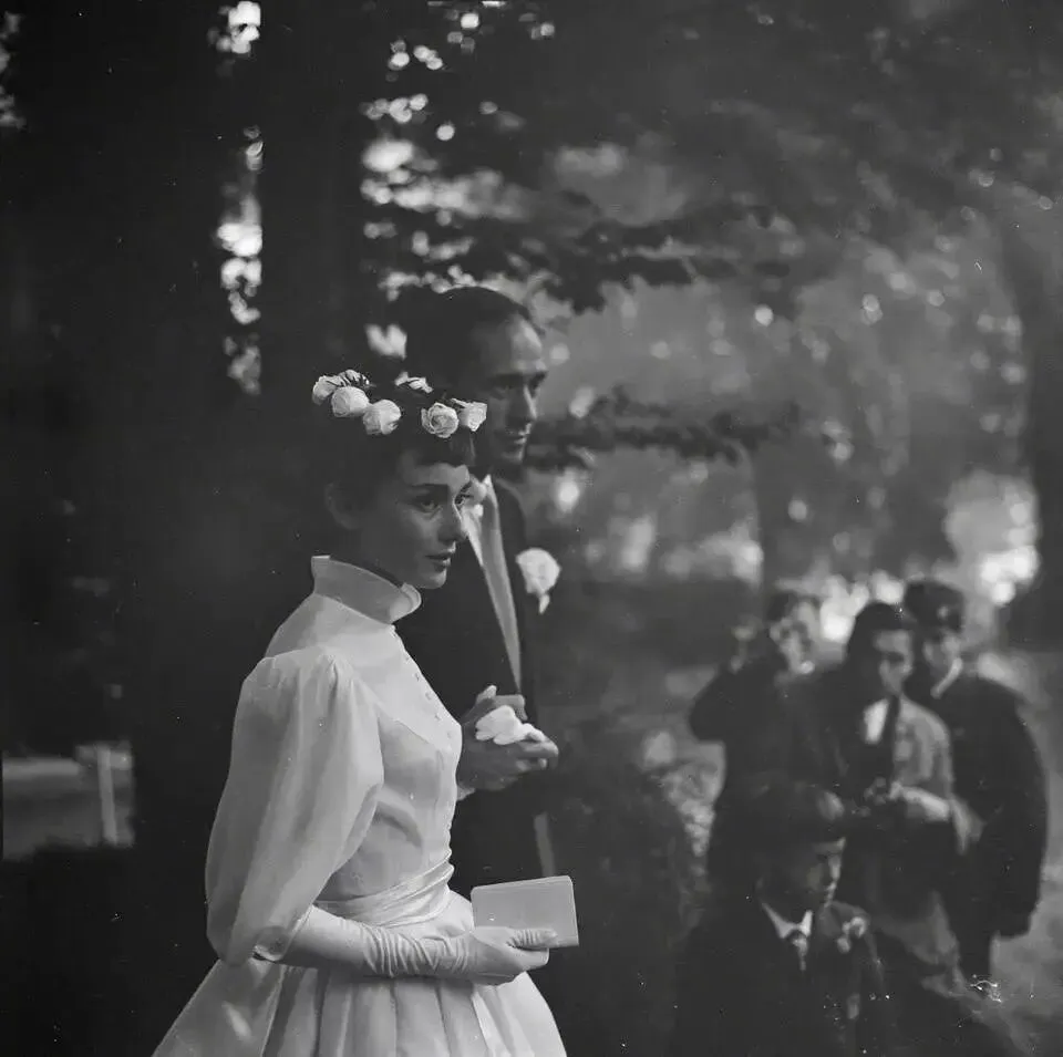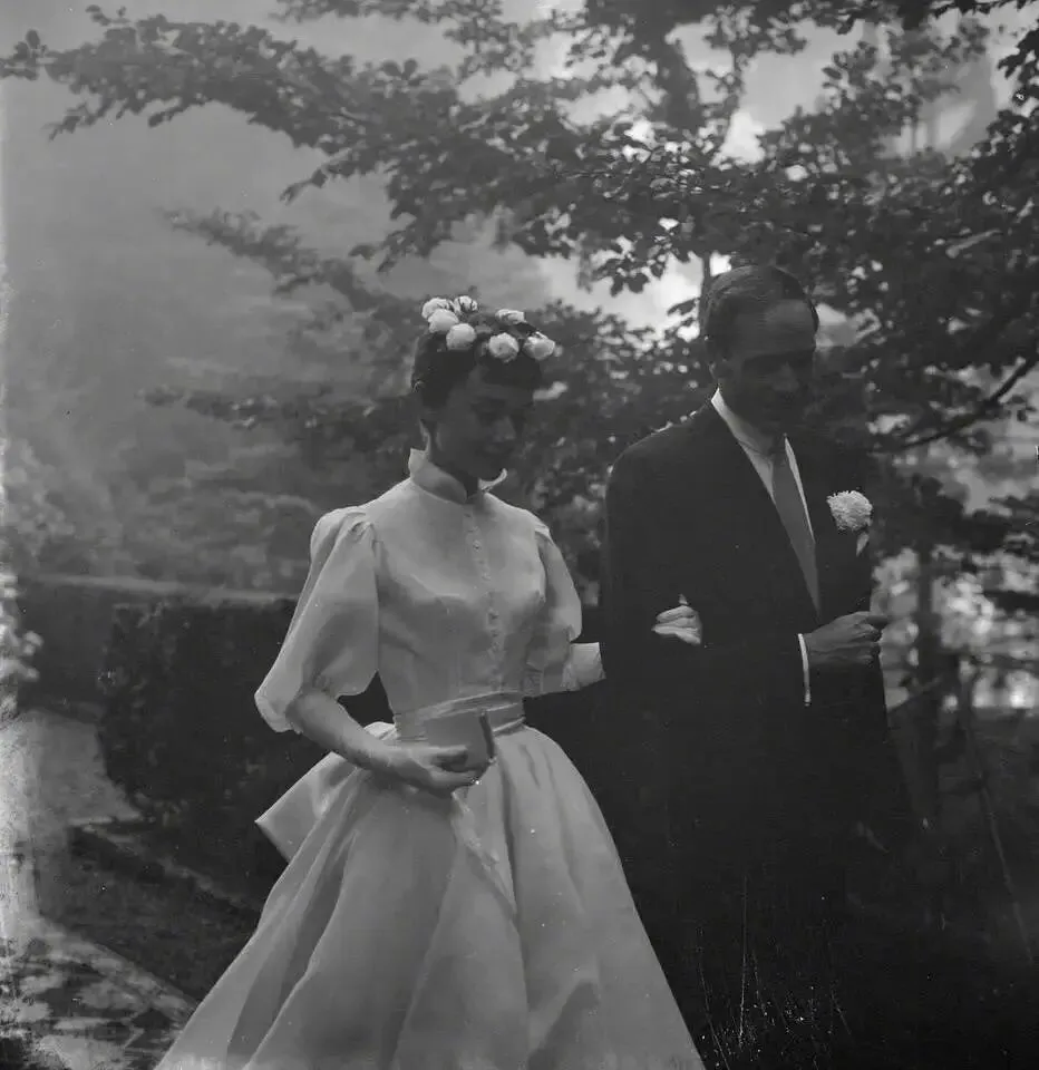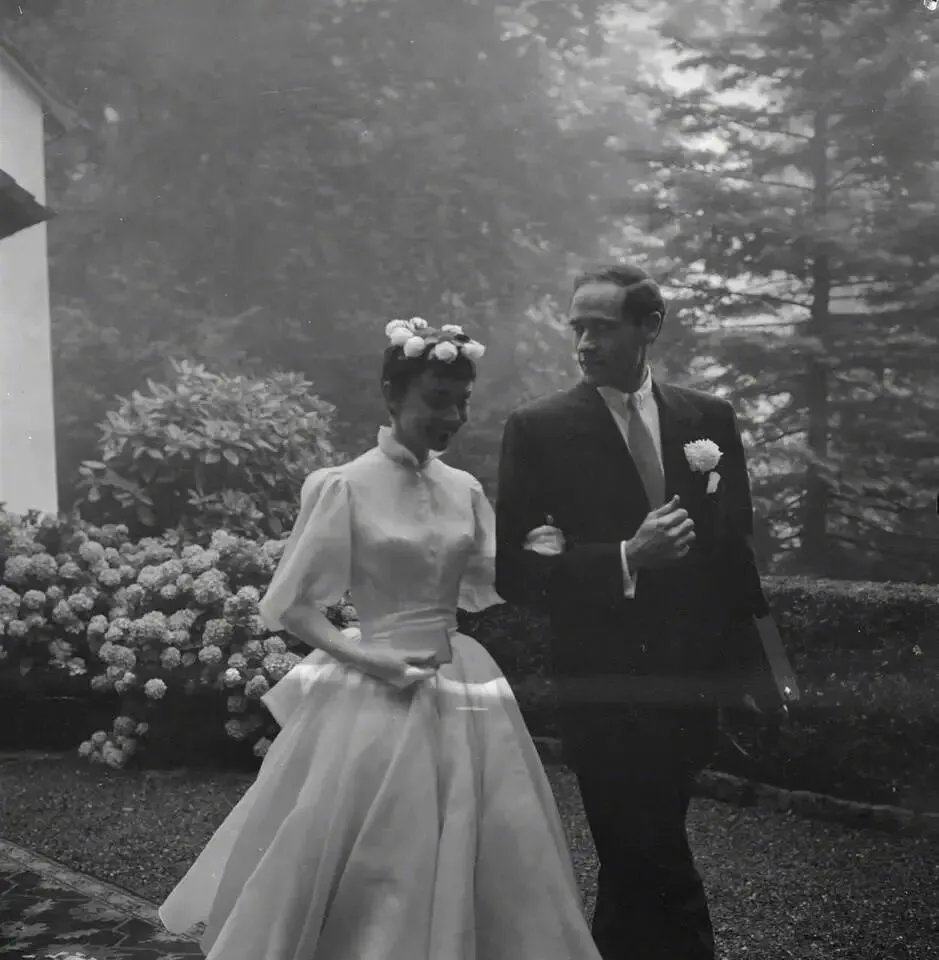 奥黛丽·赫本与第一任丈夫梅尔·费勒的婚礼。费勒与赫本在1953年《罗马假日》伦敦首映式上相识,1954年9月在瑞士成婚。