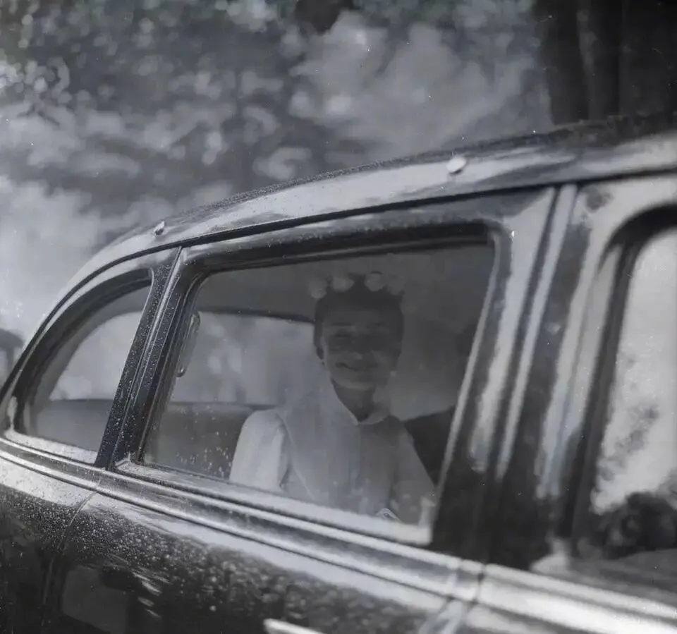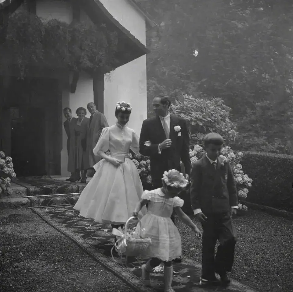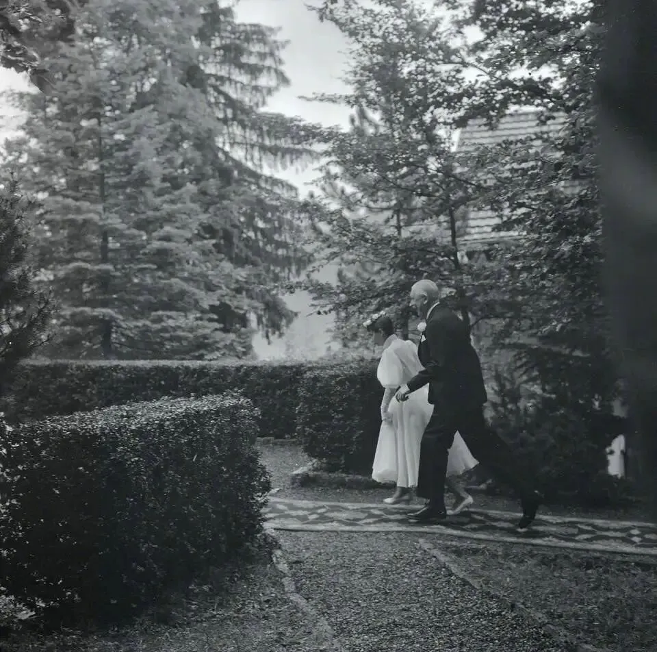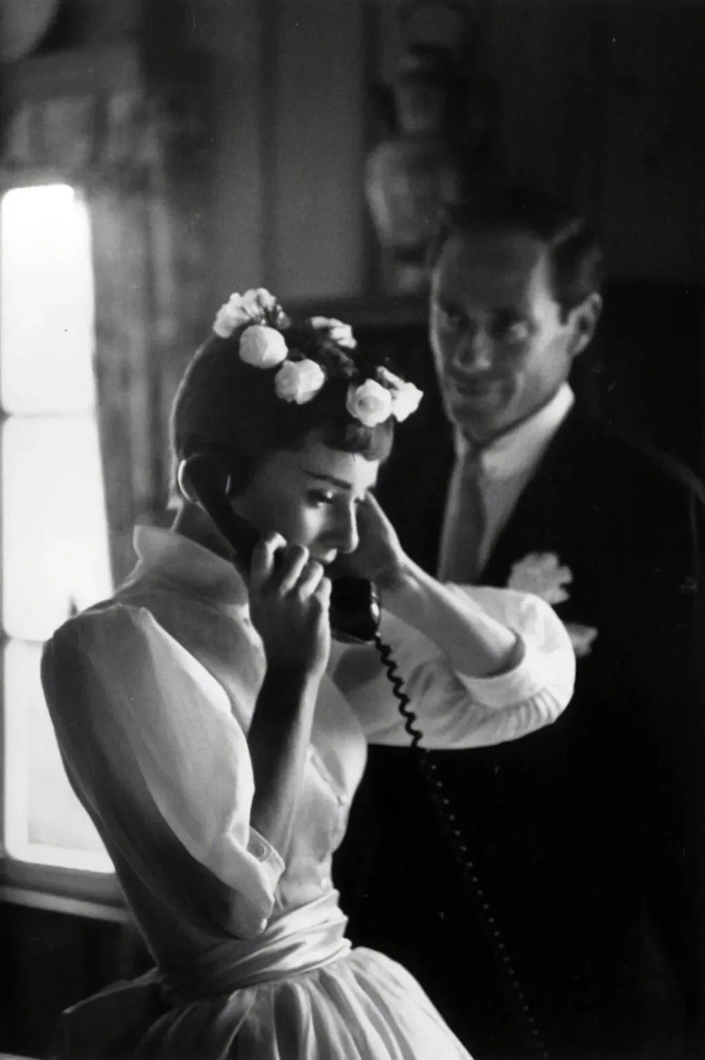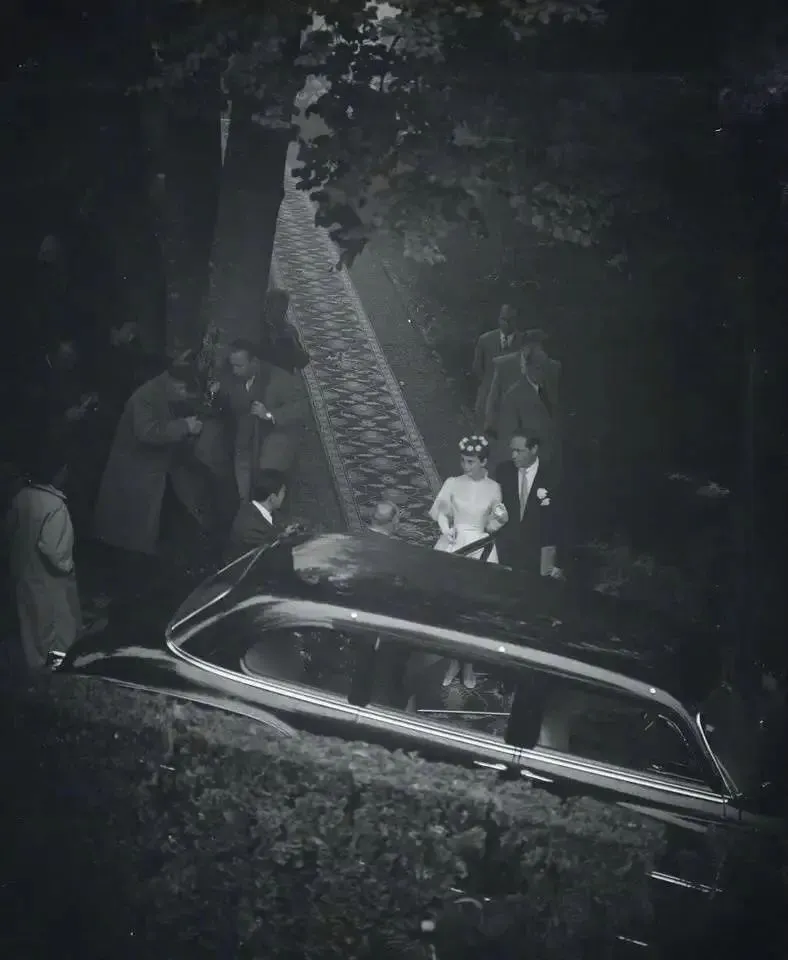 奥黛丽·赫本与第一任丈夫梅尔·费勒的婚礼。费勒与赫本在1953年《罗马假日》伦敦首映式上相识,1954年9月在瑞士成婚。