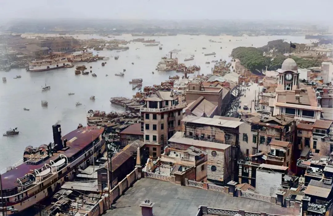 图中江面宽阔,水上清一色的大小船只,江心岛就是那会还没填埋的海珠岛,树影斜斜,周围点缀着低矮小楼,看着闲适,江边那几栋欧式老房子搁现在可见不着了,楼顶是钟楼,时针指着的,是城市最真实的时间,江里花船、货船、渡船,各有各的风骚,水波里映出当年广州的风采,现在看,珠江两岸的气势一点没输给别处。