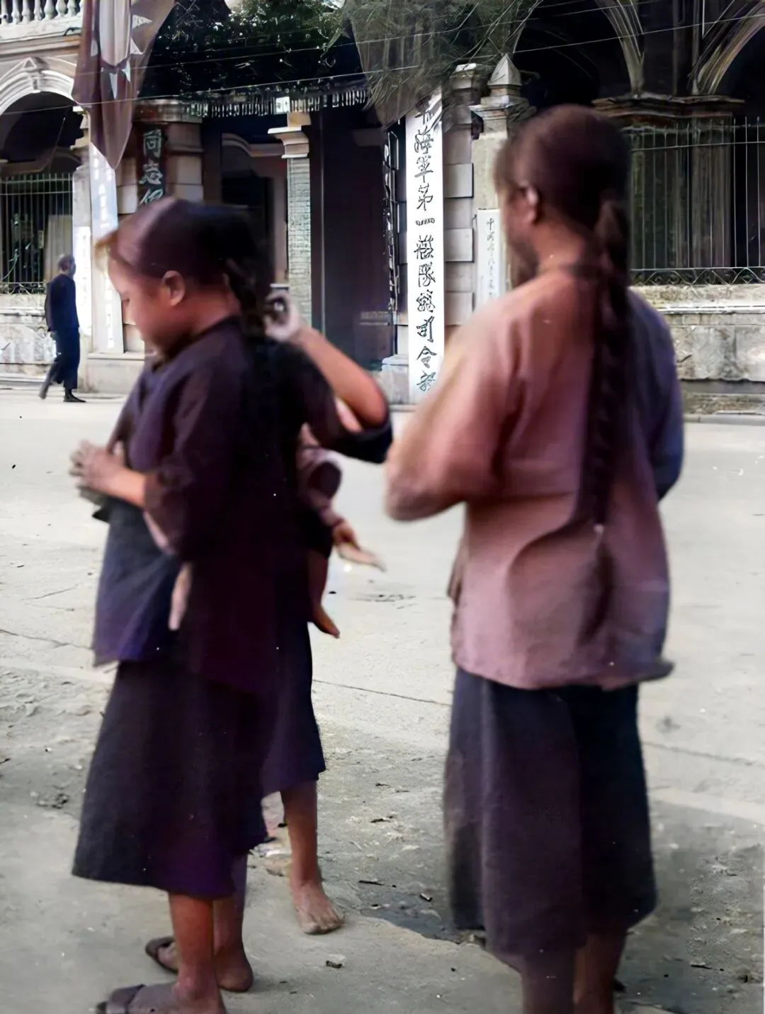 街上三个扎着长辫子的姑娘,背着光站在门口说话,裙角甩来甩去,衣服洗得发白,看着轻松自在,小时候谁家不是这样,大人叫回屋吃饭都得喊三声,这种散漫的快乐,现在小区里难见了。