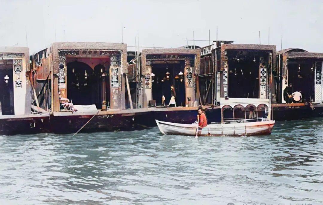 这一溜水上大船叫花舫,门面都是开着的,挂着帘子,摆着小桌凳,里面有茶杯酒壶,广州的水上生意人就是在这样的船上谈生意聊天,比陆地上的茶楼还讲究,想吃点花样什么的,就得登上船。