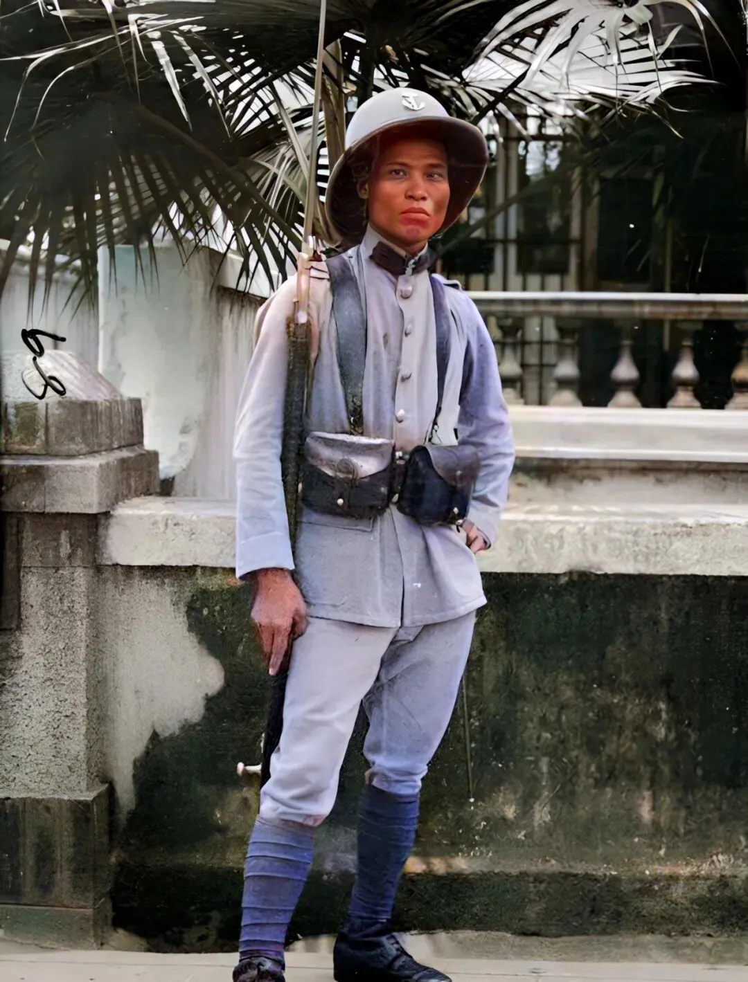 这位卫兵,制服笔挺,腰间子弹袋一左一右,肩上驼着带刀的步枪,头上那顶灰蓝色圆帽,给人一种十足的威严,把守在大门口,大人总说那会的治安靠的就是这些人,现在只在电影里才能看到这样的装备了。