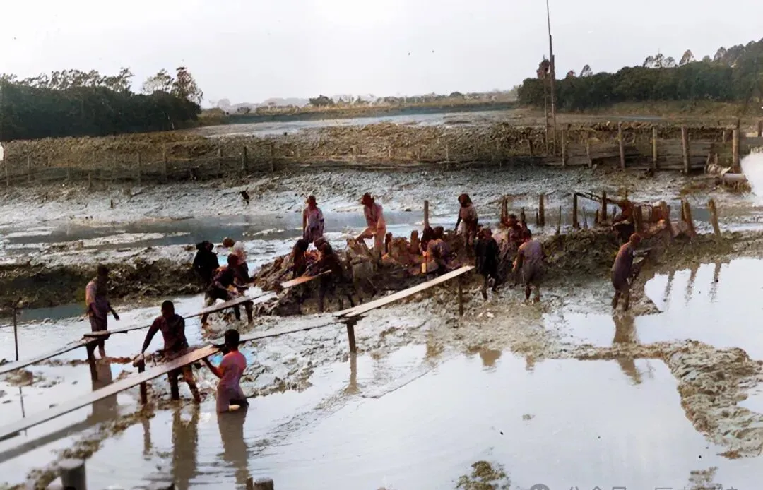 这片泥滩,挽着裤脚的人弯腰推着木板,水里泥里哧啦哧啦,人一多,干起活来像在合力舞龙,劳动的动静不小,每一步脚底都冒着泥屑,谁家有力气谁上场。