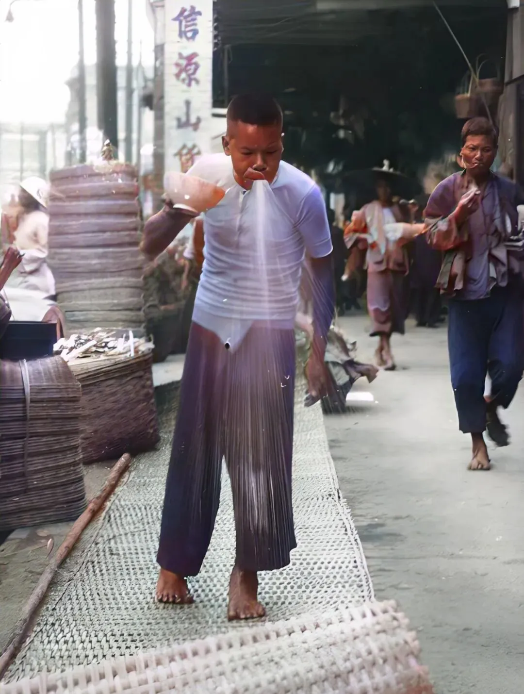 编藤器的男子正使劲喷口水打湿藤条,脚底下踩的全是簇新货,动作熟练,做出来的席子皮椅子扎实又舒坦,这门手艺如今不多见,老爸说当年新买的藤席晒在院子里,有太阳味。