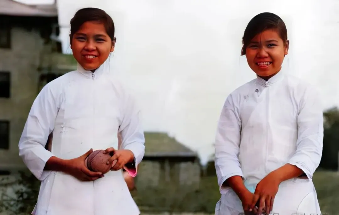 两名穿着白底校服的女学生,站在操场边上,手里捧着网球,脸上笑得灿烂,那个年代带着点书卷气的自信,现在的学生有的还有,但那份清爽特别少见。