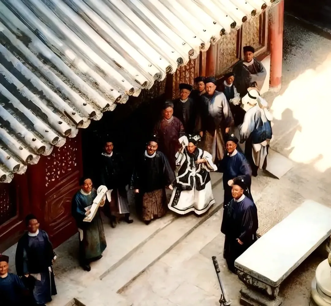 图中最中间穿着厚重大袍的就是慈禧太后,衣袖又宽又重,光看着都觉得压手,头上的珠花、翠钿一层层压着,正面朝着庙门,侧头往上瞧,身边满是贴身太监和女官,站得规规矩矩,边上几个文官都穿着长衫马褂,颜色深浅不一,里三层外三层,把中间这位烘托得更沉稳,整个画面就顶着那股子气势。