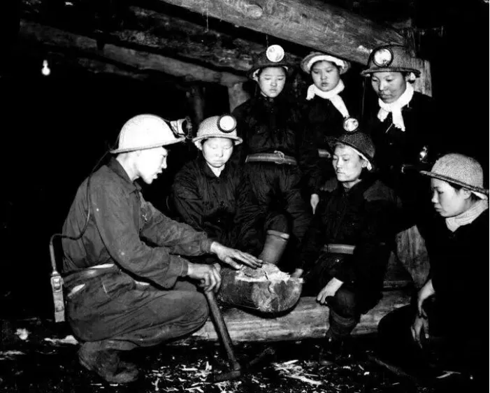 经多方考证,这张照片是峰峰王凤煤矿花木兰女子掘进队开班前安全会的场景。这是邯郸矿务局组建的首支女性井下作业队伍,成立于1958年大跃进时期,由20名女青年组成。她们挑战“女人不下井”的传统观念,由2名老矿工带教,仅半个月就熟练掌握打眼、装药、放炮等全套掘进技术。承担与男工同等强度的掘进任务,是当时全国工业战线上的先进典型。其事迹曾被《人民日报》等报道,成为激励新一代女性投身国家建设的榜样。