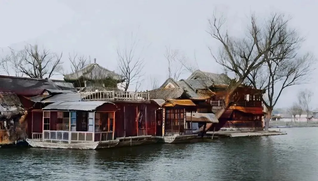 图里的这几座靠水的老船屋,木头搭建,黑瓦斜顶,脚下是湖水轻轻晃着,很多人不信屋子能浮在水面上,其实湖边的老人都见过,冬天结了冰还不沉,坐在屋里能听见鱼跃水面的鼓动,妈妈说她小时候去亲戚家串门,总觉得水上人家软和又暖和,跟在街面上住是两种滋味。