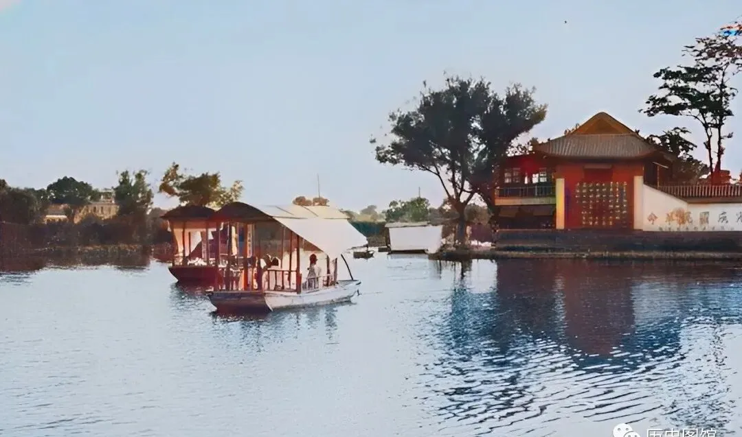 湖面上的这条游船,白帆轻遮半边檐,船头一竿撑起,里头一家老小围坐一圈,景好了,船夫还会唱一小段,舀水洗脸,孩子们靠着栏杆往外看,现在坐游船要买票,过去随便哪家搭船一喊就能走,省劲。
