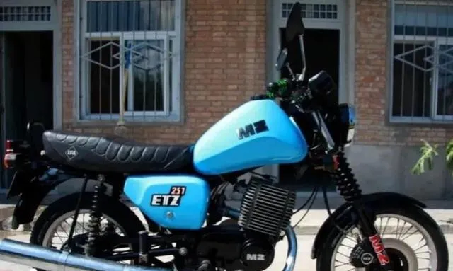 第一张这辆依发251,光看外形就知道不是“软绵绵”的类型。天蓝色油箱特别打眼,车架黑得发亮,座椅又长又厚,像那个年代常见的皮沙发,一看就结实。它最大的感觉就是敦实,不是轻飘飘的小车,而是压得住路面的那种。