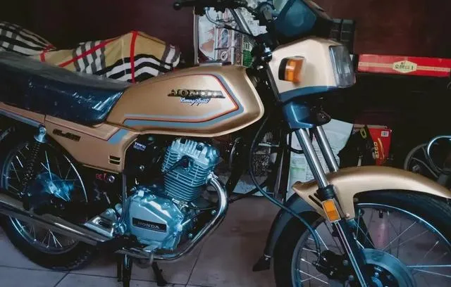 这辆本田GL145,一眼看过去就觉得高级。金色和蓝色搭在一起,挺少见,车头方灯也很有辨识度。别看它只是静静停在屋里,那个年代能拥有一辆本田,已经不是普通家庭能轻松做到的事了。