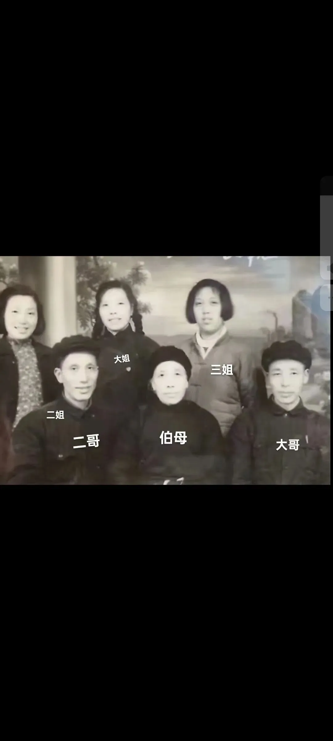 照片是我一位堂伯母生日时,和她的两个儿子、三个女儿的合影(当年堂伯父已经逝世了)。现在照片中只有二姐还在世,已经九十八岁了,其他人都已作古。
