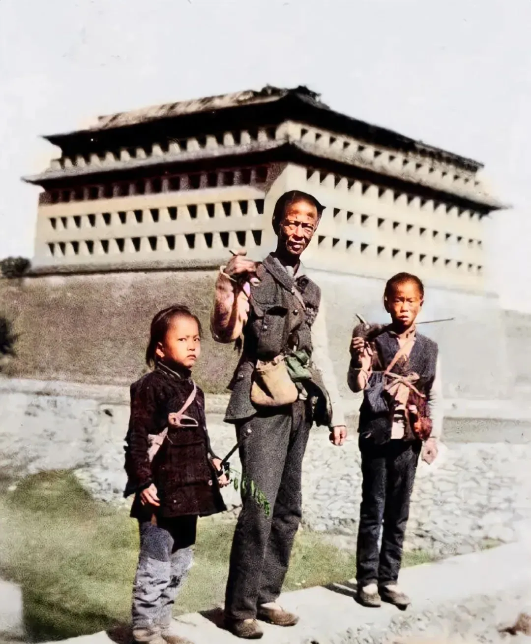 照片里瘦高个子男人带着儿子女儿,站在城墙下头,身上一兜子皮带子,全是子弹包、猎枪、刀,地道的老猎人装束,嘴角一点笑没有,看着火车上有人拍照,是默许也是警惕,旁边的小男孩拿着一把小鸟铳,神情比大人还认真,小姑娘手里攥着树枝,明显不乐意——眼神冲着镜头,一点不遮掩的脾气。