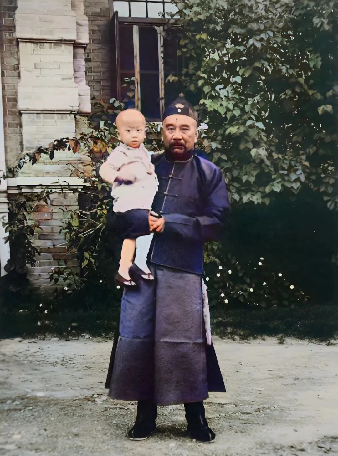 照片上的这位,穿着黑蓝长袍,大圆脸一抬,怀里抱着小孩,神情淡淡的,这种穿法、剪裁、帽子,一看就是清末到民国初的大户人家,还真不是街头巷尾那个味道,孩子眼神直溜溜盯着镜头,有点怯生生的意思,大人却纹丝不动,感觉像是遇事不慌的老油条。
