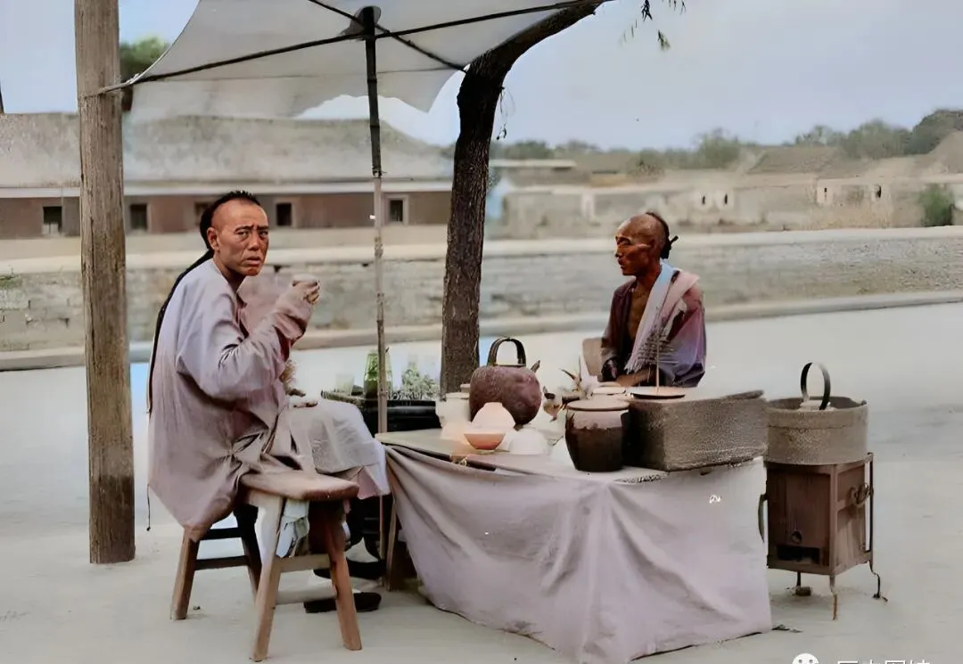 这照片一眼看出味道,路边柳树底下撑起把白布伞,桌上瓦壶土瓷碗,围着喝茶的是俩打扮半旧的老头,摊主笑眯眯往茶碗里续水,喝茶的不紧不慢,像是刚赶完路坐歇着,旁边一只木箱炉子,桌面板凳都是土做的。