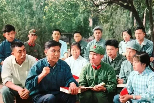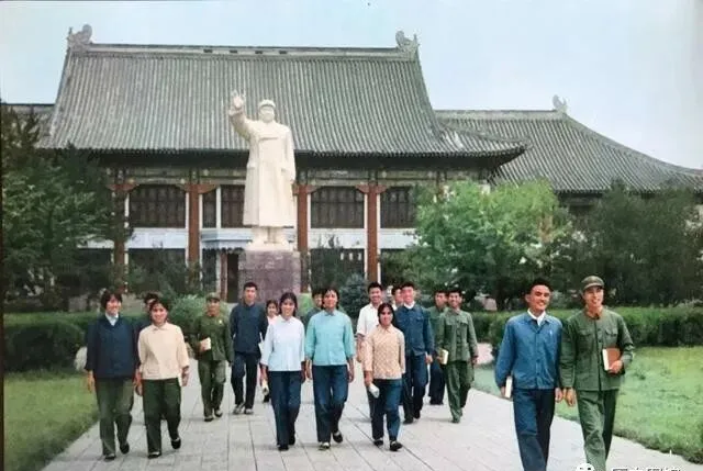 这一群人结伴走在校园大道,背后是高高的大礼堂、毛主席雕像,穿梭其间不花哨,谁手上抱本书,谁夹着饭盒,有带套袖的,有穿解放鞋的,女同学扎两个麻花辫,男同学皮肤晒得黢黑,一路上有说有笑,还有人嘴里咬着铅笔头凑过来,这种走队形其实像锻炼队伍,经常彼此帮着补习功课,没书就挤一块看,教室不够,露天那块空地铺页报纸,照样能听老师讲课。