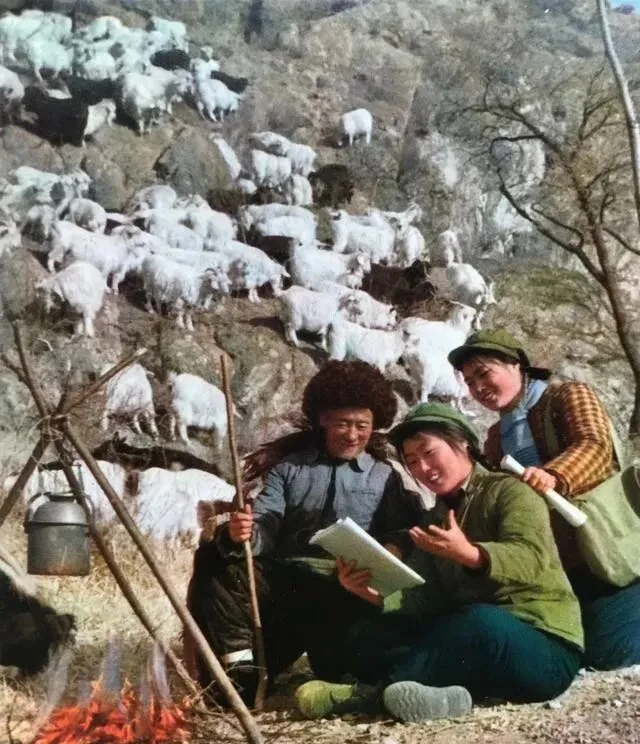 再看这一组,几个女同学扛着羊鞭,后头是满山坡跑的羊群,脚下篝火滋滋响,怀里还夹着课本,她们是下乡支教的大学生,“一边劳动一边读书”不是说说,地头学政治,山脚背语文,羊群都成了最忠实的听众,有时候教完孩子回头还能记得当年自己也被老师拉到地头点名提问的日子,那会讲究知识和劳动两手抓,真正在泥巴和风里琢磨怎么学会本事。