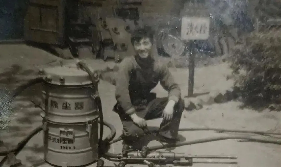 1960年3月时的焦作市煤矿技术工人使用干式吸尘凿岩机。