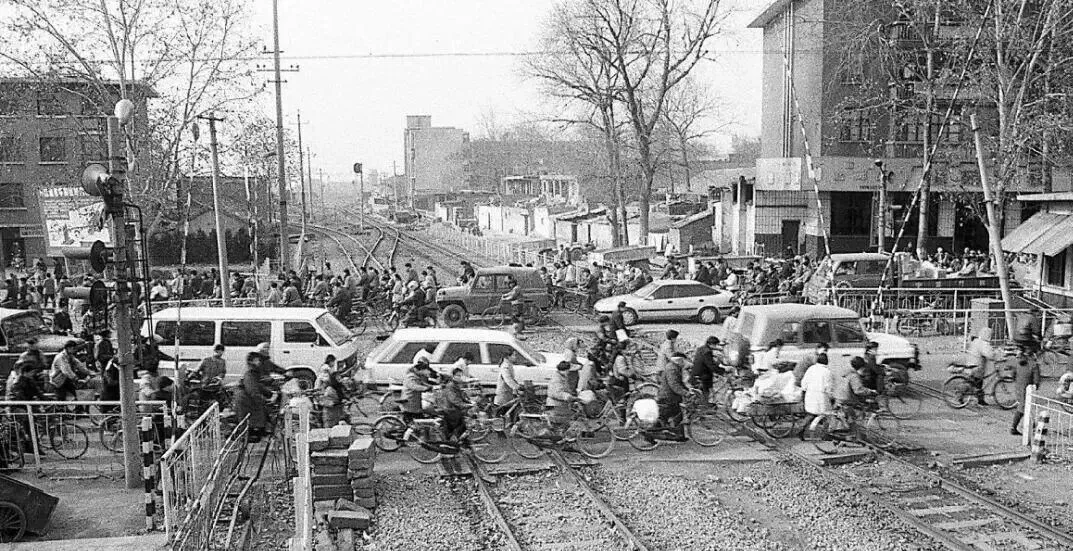 90年代末时的焦作市区里的铁道,那时经常遇到火车经过,杆子放下来,大家停留等待,杆子抬起来,人们依次通过。