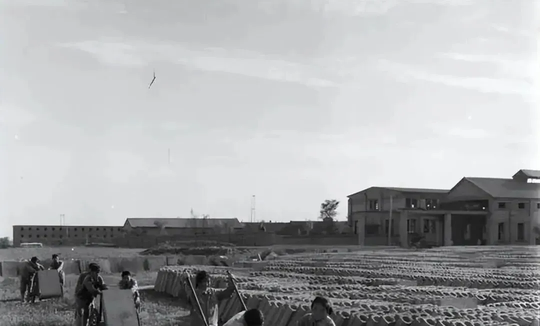 昔日的焦作酸盐制品厂试制成功的煤矸硅酸盐空心砖块的作业区景象。