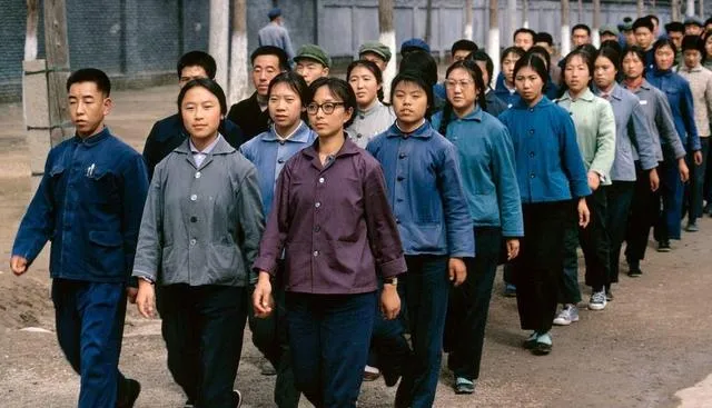 第一张最抓眼的,是这队年轻人整整齐齐往前走。衣服颜色很简单,蓝的、灰的、紫的,都是那个年代常见的布料和款式,宽松、耐穿,也不怎么讲究“显身材”。可你仔细看,会发现一点都不呆板。前排那个戴眼镜的姑娘,神情很稳,脚步也利落;旁边几个年轻人脸上没有什么夸张表情,但都很精神。那种朴素,不是灰扑扑的,而是干净利索的。